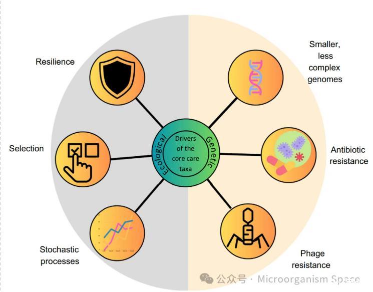 该研究发现,稀有微生物群与核心微生物群在时空维度上的存在具有一致性。尽管他们没有专门研究核心稀有微生物群,但有可能永久性稀有微生物群的成员在时间尺度上以低丰度存在于核心微生物群中。然而,目前尚无研究对这一假设进行实证验证,因此,导致核心稀有物种持续存在的因素也尚未得到探索。在接下来的部分中,我们将尝试确定能够支持核心稀有物种持续存在的生态和基因组驱动因素(图2)。