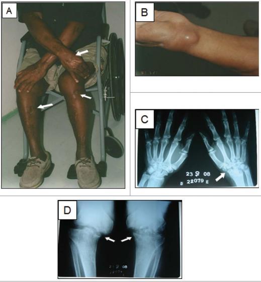 一名61岁的退休砖瓦工,患有糖尿病和高血压,因6年皮肤病变病史被转诊至巴西里约热内卢埃万德罗·沙加斯国家传染病研究所(INI)的感染性皮肤病学实验室。初步诊断后,他接受了5个月的碘化钾治疗,导致皮肤病变愈合。然而,他抱怨膝盖和左腕关节疼痛逐渐加重,以至于在到INI就诊前2年需要轮椅。在我们INI评估前6个月,他注意到皮肤病变复发。
