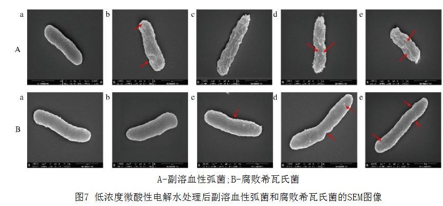 为了证实低浓度微酸性电解水引起的细菌损伤,采用扫描电子显微镜观察处理后的菌体形态。对照组的副溶血性弧菌和腐败希瓦氏菌,均表现出典型的革兰氏阴性杆菌的结构,表面规则光滑。经低浓度微酸性电解水处理的副溶血性弧菌表面出现明显的凹陷及褶皱,且随着低浓度微酸性电解水浓度的升高,菌体严重皱缩甚至形成不规则小孔,导致内容物泄漏。而腐败希瓦氏菌经低浓度微酸性电解水处理后表面结构无明显坍塌,仅在质量浓度≥2毫克/升时出现凹陷和皱缩。结果表明,低浓度微酸性电解水对2种细菌都具有一定的损伤作用,破坏程度呈浓度依赖性。并且在相同浓度下,副溶血性弧菌较腐败希瓦氏菌表现出更显著的结构变化。