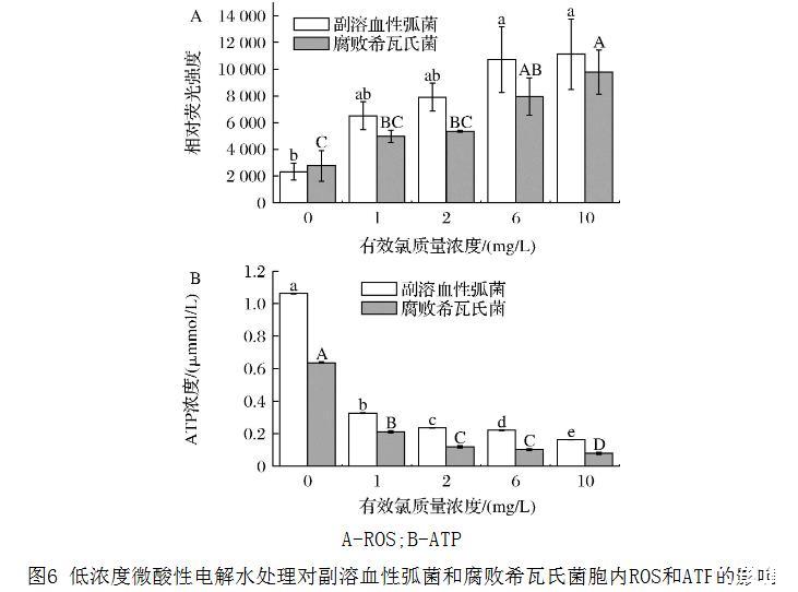 图6 低浓度微酸性电解水处理对副溶血性弧菌和腐败希瓦氏菌胞内活性氧和ATP的影响