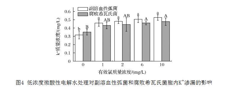 K+是细菌内最丰富的阳离子,参与基本的生命活动,并调节细胞的渗透压和氧化还原电位。钾通道的激活和钾离子的泄漏与超极化现象密切相关,K+的泄漏已被用来监测抗菌剂造成的细菌膜破坏。如图4所示,除了腐败希瓦氏菌在有效氯浓度为1、2毫克/升时,经低浓度微酸性电解水处理后2种细菌的上清液中K+浓度都具有显著性差异,与膜电位检测结果完全吻合。细胞内K+的损失会造成多种代谢途径受阻,破坏细胞渗透压的调节和内环境稳定。