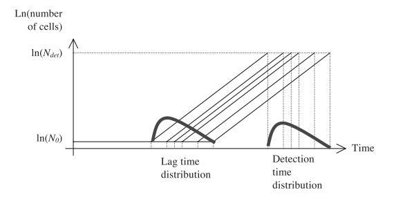 单个细胞的延滞时间与群体延滞期之间的联系并不直接。Baranyi(1998,2002)和Baranyi和Pin(2001)分析了这一点,并推导出一个数学公式,将个体延滞时间的分布与整个群体的延滞期联系起来。该公式意味着,个体延滞时间的平均值可能远长于群体水平观测到的延滞期,尽管个体生理状态参数的平均值与群体的生理状态参数相同。此外,从延滞期到指数期的过渡曲线可以通过个体延滞时间分布的变换获得,但就当前可用数据的精度而言,从群体生长曲线推断个体延滞时间的分布是不可能的。因此,使用传统活菌计数无法研究单个细胞的延滞时间。自动化浊度测量可能提供解决方案,因为它们适合产生大量重复检测时间测量数据。如果每个观测培养物从一个单细胞开始,那么检测时间的分布应接近初始单个细胞延滞时间的分布,假设由单细胞产生的每个群体的比生长速率相同且恒定。