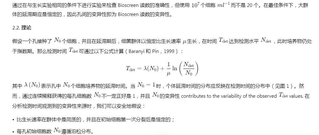 传统上,延滞期在“细胞浓度对数-时间”曲线上定义。延滞期结束时间是生长曲线指数期切线与接种物水平相交的时间点。Baranyi和Roberts(1995)提出了一个更机械化的定义。引入了初始生理状态参数(a₀),延滞期计算为a₀及后续比生长速率的函数。