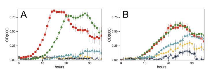 培养。C. phytofermentans ISDg (ATCC 700394) 在Coy厌氧工作站中,在1.5% H2/98.5% N2气氛下进行厌氧培养。培养物在30°C、pH调整为7的GS2培养基(18)中静置培养,并如文中所述补充碳源。生长动力学通过密封的100孔微孔板(Bioscreen 9502550)中的600 nm光密度(OD600)监测,如前所述(19);每次光密度测量前,对培养物进行短暂摇晃以重悬细胞。用于底物消耗和发酵产物分析的纤维素、纤维二糖和葡萄糖培养物在100-ml血清瓶中生长,脱气后用丁基橡胶塞密封。