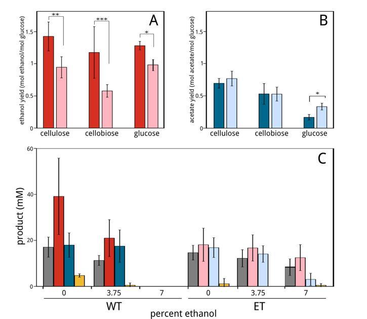木质纤维素生物质在单一反应器中进行水解和发酵的新型加工策略,为生物商品和生物燃料的生产提供了巨大的潜在成本节约。一个关键挑战是在高产物浓度下保持高酶产量。为实现此目标,我们对纤维素分解、产乙醇的细菌Clostridium phytofermentans进行了适应高乙醇浓度的驯化。获得的乙醇耐受性(ET)菌株的乙醇耐受性几乎比野生型提高了一倍,但在低乙醇浓度下乙醇产量和生长速率均有所降低。ET菌株的基因组在涉及膜生物合成、Rnf复合物、阳离子稳态、基因调控和乙醇生产的蛋白质中发生了编码变化。特别地,对突变型双功能乙醛辅酶A(CoA)/醇脱氢酶的纯化表明,G609D变体使其活性(包括乙醇形成)丧失。在ET菌株中异源表达Zymomonas mobilis的丙酮酸脱羧酶和醇脱氢酶,增加了纤维素消耗并恢复了乙醇产量,证明了如何利用代谢工程来克服在乙醇适应过程中产生的不利突变。我们讨论了ET菌株的遗传变化如何揭示了提高微生物溶剂耐受性的新的潜在策略。