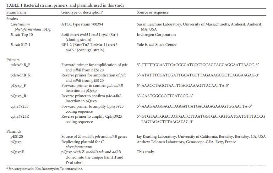 大量努力集中在使梭菌适应更高的溶剂水平,并研究与溶剂适应相关的遗传和生理变化(8-13)。其他研究表明,在主要产生乙醇以外发酵产物的梭菌中,乙醇产量得到提高。表达丙酮酸脱羧酶和醇脱氢酶(ADH)的C. celluloyticum克服了丙酮酸积累,并将发酵产物从乳酸转变为乙酸和乙醇(14)。在C. thermocellum中,通过丙酮酸激酶(15)重定向碳流、失活乳酸脱氢酶和磷酸转乙酰酶(16)以及删除氢化酶(17)均能改善乙醇生产。这些结果表明,尽管基因工具现在才被开发出来,但在纤维素分解梭菌中工程化改进乙醇生产是可能的。然而,开发既耐受乙醇又能高产乙醇的菌株仍然是一个重大挑战。