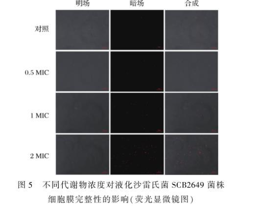 图5不同代谢物浓度对液化沙雷氏菌SCB2649菌株细胞膜完整性的影响(荧光显微镜图)