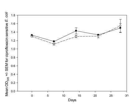 图:从生物固体堆肥中检测可溶性环丙沙星。将环丙沙星敏感的大肠杆菌(K-12菌株)在添加了19 ppm环丙沙星的堆肥(CIP,实线)和未添加的堆肥(CTL,虚线)的水提取液中进行培养。通过测量OD595来评估培养物密度,图中显示的是三个独立重复样品在生长24小时后的平均值。)