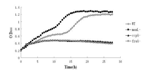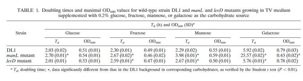 戈登氏链球菌manL和levD突变体的表征。为了评估manL和levD在戈登氏链球菌中的功能,使用非极性em盒在DL1株背景下构建了等位基因替换突变体。为了确定manL和levD在碳水化合物转运中的作用,使用Bioscreen C监测了野生型菌株以及manL和levD突变体在补充了0.2%葡萄糖、果糖、甘露糖或半乳糖的TV培养基中的生长。与野生型菌株相比,manL突变体在葡萄糖和甘露糖中的生长速率较慢,在半乳糖中显著减慢,但在果糖上仅略微减慢(表1),表明ManL可能参与戈登氏链球菌对葡萄糖、甘露糖和半乳糖的摄取。相反,levD突变体在存在果糖或甘露糖的情况下生长比DL1慢,这表明LevDEFG在这些己糖的转运中起作用。当在葡萄糖中生长时,野生型菌株和levD突变体之间的倍增时间没有显著差异。