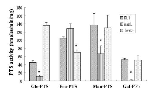 为了验证ManL和LevD在糖转运中的作用,将DL1以及manL和levD突变体在含有0.5%葡萄糖、果糖、甘露糖或半乳糖的TV中进行厌氧培养。在指数中期收集细胞,并分别使用葡萄糖、果糖、甘露糖或半乳糖作为底物测量PTS比活性。与DL1菌株相比,manL突变体对葡萄糖、甘露糖和半乳糖的PTS活性显著降低,但对果糖的活性略有增加。levD突变体对果糖的PTS活性显著降低,对葡萄糖的活性显著升高,而对甘露糖和半乳糖的PTS活性变化很小(图2)。这些结果进一步支持ManL参与葡萄糖、半乳糖和甘露糖的转运,并且可能也参与果糖的利用,而LevD似乎主要负责果糖的内化。