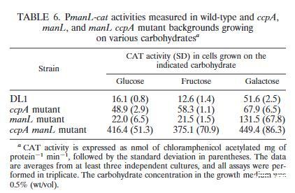为了进一步测试CcpA是否调节manL表达,构建了PmanL-cat融合并将其引入野生型和ccpA突变株。在葡萄糖、果糖或半乳糖中生长时,ccpA突变体中PmanL-cat融合的表达显著高于野生型背景(表6),这一发现表明CcpA对manL的负向调节。同样值得注意的是,在野生型背景中,半乳糖中的manL表达高于葡萄糖或果糖,这可能是因为与葡萄糖或果糖相比,半乳糖通过CcpA诱导CCR的效率较低。半乳糖应流经戈登氏链球菌的塔格糖途径,产生的葡萄糖-6-磷酸(G-6-P)和果糖-1,6-二磷酸(F-1,6-bP)少于在葡萄糖或果糖上生长。由于G-6-P和F-1,6-bP是HPr激酶的激活剂,因此在半乳糖上生长的细胞中,CcpA依赖的manL抑制将不那么严重。与这一概念一致,在缺乏CcpA的菌株中,manL对不同糖的反应表达水平差异很小(表6)。