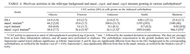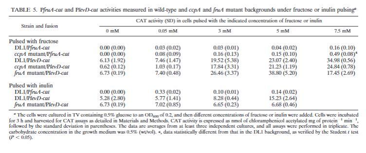当评估PfruA-cat和PlevD-cat融合在果糖脉冲下的表达时,在ccpA突变体中fruA出现了2到5倍的去抑制(表5)。然而,在相同条件下,ccpA突变体中levD的表达总是低于野生型背景中测量的水平。值得注意的是,在fruA或levD的启动子区域附近无法检测到明显的CRE序列。