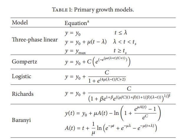使用五种初级生长模型分析生长曲线。这些生长模型基于线性(源自Monod模型)或非线性(Gompertz、Logistic、Richards和Baranyi)方程(表1),并重新参数化以反映Zwietering等[3]推导的微生物生长参数。