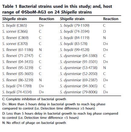 表 1 本研究中使用的细菌菌株;以及宿主 SboM-AG3 对 24 种志贺氏菌菌株的作用