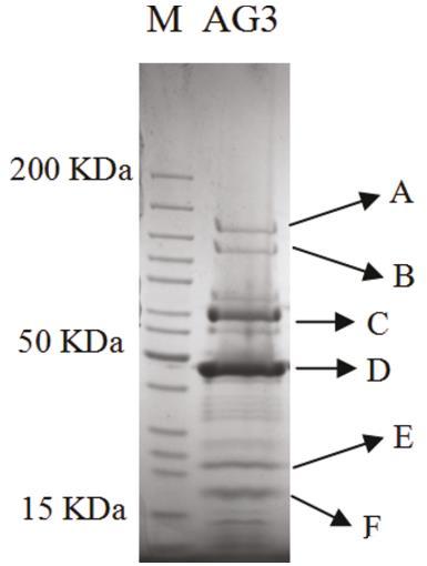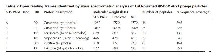 氯化铯纯化的 SboM-AG3 病毒粒子通过一维 SDS-PAGE 分析,显示出 15 个蛋白条带(图 4),分子量分别为 12.7、15.6、17.7、21.9、27.2、32.4、34.3、35.7、37.3、44.6、60.4、67.9、76.5、107.5 和 126.3 kDa,基于与大小标记的比较。六个最强烈的条带(命名为 A 到 F)被切下并通过 QqTOF 质谱进行分析。蛋白条带 B 到 F 的观察质量明显与 SDS-PAGE 预测的大小相似(表 2)。