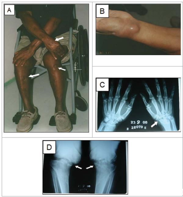 一名61岁的退休砌砖工,患有糖尿病和高血压,因6年皮肤病变病史被转诊至里约热内卢Evandro Chagas国家传染病研究所传染病皮肤病学实验室。初步诊断后,他接受了5个月的碘化钾治疗,皮肤病变愈合。然而,他主诉膝盖和左腕关节疼痛逐渐加重,至转诊至INI前两年需坐轮椅。转诊至INI前6个月,他注意到皮肤病变复发。