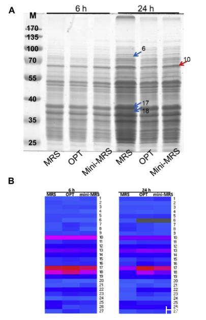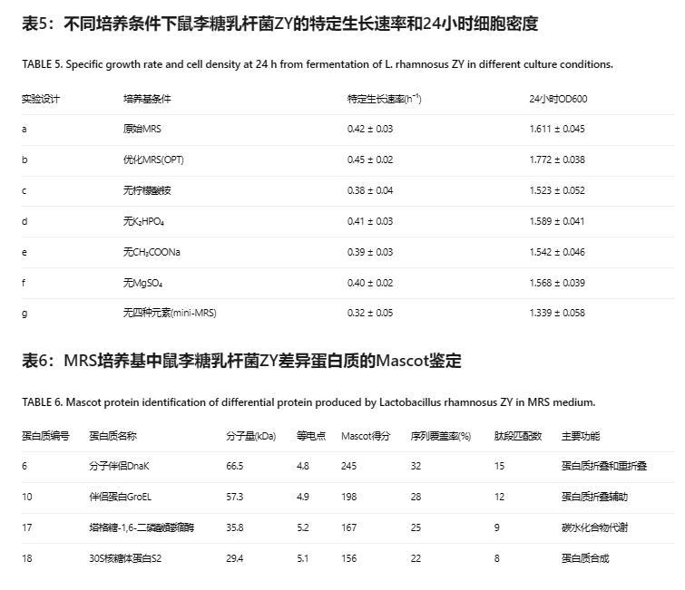 此外,总细胞蛋白质的SDS-PAGE分析,随后进行聚类分析,如图4所示。这些结果表明,鼠李糖乳杆菌ZY在6小时具有相似的蛋白质模式,这与MRS、OPT和mini-MRS培养基在早期生长阶段的特定生长速率一致(图2),而三种条件下24小时的蛋白质谱不同。选择条带10作为Quantity One分析的内部标准,随后使用PermutMatrix软件进行双向层次聚类分析。如图4B所示,条带6、17和18对应于来自MRS培养的ZY菌株中的不同蛋白质(即黑色和红色条带)。条带6的蛋白质在MRS中明显显示比OPT和mini-MRS培养条件下浓度更高,而条带17和18的蛋白质浓度在OPT培养基中略高。因此,通过MALDI-TOF-TOF进一步分析四种选定蛋白质。详细的Mascot鉴定信息(表6)表明,通过质谱鉴定的蛋白质6是分子伴侣DnaK,蛋白质10是伴侣蛋白GroEL,蛋白质17是塔格糖-1,6-二磷酸醛缩酶,蛋白质18是30S核糖体蛋白S2。MRS培养基中的差异蛋白DnaK协助新生多肽链折叠和错误折叠蛋白质重折叠。关于塔格糖-1,6-二磷酸醛缩酶和核糖体蛋白,这些蛋白质受环境条件高度调控,以有效利用碳源,例如通过利用OPT培养基中更大量的葡萄糖。由于串联质谱技术可用于从复杂培养条件中发现差异蛋白质,并从新菌株中发现新酶,我们的结果通过这种替代蛋白质组学方法初步确定MRS培养基中对乳杆菌关键的成分是与碳源浓度相关的那些。通过转录水平检测关键因素浓度影响细胞生长的进一步研究是必要的。