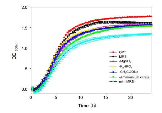 根据表3中正交实验设计的ANOVA分析,MRS培养基中的许多微量元素,如K2HPO4、CH3COONa、MgSO4和柠檬酸铵,被认为对鼠李糖乳杆菌ZY的生物量没有显著影响。因此,进一步研究了从MRS培养基中简单去除这些微量元素的经济策略。实验设计如表5所示,针对以下培养基组成:原始MRS、OPT、无柠檬酸铵、或无K2HPO4、或无CH3COONa、或无MgSO4、以及无MRS中四种元素(mini-MRS)。微量元素对特定生长速率和最大生物量的影响如表5所示。显著影响特定生长速率的关键微量元素排序为:柠檬酸铵 > CH3COONa > MgSO4和K2HPO4。最后,在mini-MRS中发生最小OD600为1.339,其中去除了所有四种微量元素。如图2所示,鼠李糖乳杆菌ZY在6小时前的早期阶段在各种条件下生长相似。最后,在MRS、OPT和mini-MRS培养基中显示出生物量和特定生长速率的主要差异。这表明单个微量元素对细胞生长的影响略微显著,而总微量元素或含有补充来源也显著参与乳杆菌代谢。