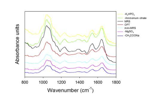 代表在不同发酵条件下生长的细菌细胞的ATR-FTIR光谱。大分子功能群对应的吸收带分配总结在表S2中。在样本中,在光谱的碳水化合物区域(1200-950 cm-1)以及对应于磷酸盐(~1225 cm-1)拉伸、酰胺I和II带中C=O和C-N基团的区域观察到细微差异。这些结果表明细胞表面成分发生构象变化。然而,在不同培养条件下处理的样本中未观察到鼠李糖乳杆菌ZY表面特性的明显影响。据报道,发酵特性(包括生长培养基、发酵温度和pH)也影响细胞产量和细胞特性。因此,本研究采用FTIR光谱技术,该技术通过先进的化学计量学技术系统革新,从高光谱数据中提取(生物)化学信息,以研究培养基对鼠李糖乳杆菌ZY表面特性的影响。