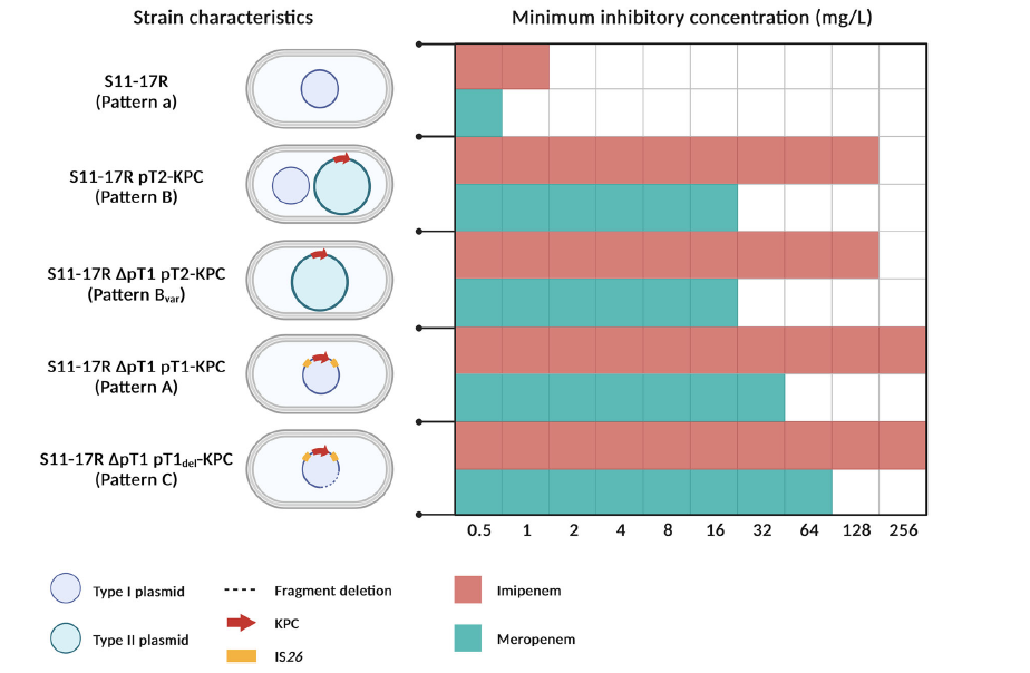产肺炎碳青霉烯酶的铜绿假单胞菌(KPC-PA)分离株在中国迅速扩增,尤其是高危克隆ST463。旨在探索推动ST463克隆成功的KPC相关质粒的进化。本研究对2011—2020年收集的1258株临床铜绿假单胞菌菌株进行全基因组测序,识别出106株ST463-PA菌株,其中KPC的检出率为90.6%。研究发现在早期(2011—2012年),ST463-PA获得了编码KPC的II型(pT2-KPC)或I型质粒(pT1-KPC)以克服碳青霉烯类抗生素的压力。2012—2017年间,由于pT1-KPC质粒具有较低的适应性成本和IS26驱动的blaKPC扩增能力,其成为主导质粒。到2017—2020年,pT1-KPC质粒发生大片段缺失,形成了pT1del-KPC质粒。该质粒具有更低的适应性成本、增强的blaKPC-2基因稳定性和更大的拷贝数灵活性,同时保持了水平传播能力。因此pT1del-KPC质粒最终取得成功,使ST463成为中国的主要ST。研究还评估了不同质粒模式在ST463遗传背景下的适应性成本,并发现携带pT1del-KPC质粒的菌株在无抗生素或高浓度美罗培南条件下比携带pT1-KPC质粒的菌株具有更高的适应性。在低浓度美罗培南压力下,pT1del-KPC质粒通过增加质粒拷贝数来放大blaKPC-2基因,而pT1-KPC质粒则通过IS26介导的blaKPC-2基因扩增来响应。这些发现强调了进化压力推动ST463优势的形成,并强调了需要有针对性的策略来控制其传播和抗生素抗性的发展。