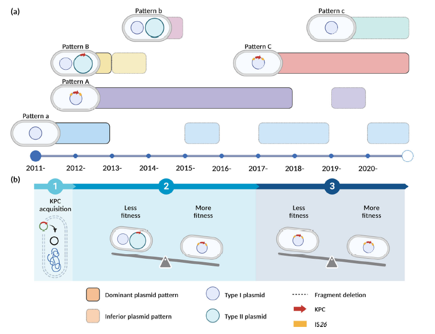图2、ST463-PA分离株中KPC相关质粒的进化过程。a在研究中,来自ST463-PA分离株的不同KPC相关质粒模式的时间分布。每年的显性和从属质粒模式分别以实线的不透明色和虚线的透明色为标志。b关于ST463-PA分离株中KPC相关质粒多阶段进化轨迹的提案。
