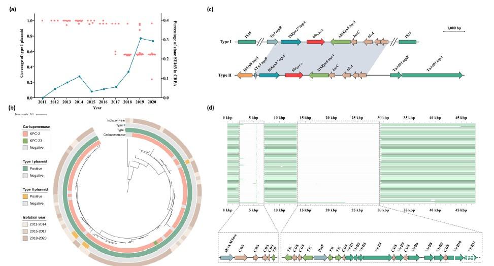 图1、本研究纳入的106株ST463-PA分离株的基因组特征。a)ST463-PA分离株中I型质粒覆盖率(针对pS11-17进行爆破)的分布(以红点表示);以及克隆ST463在CRPA分离株中的患病率(以蓝线表示)。b)ST463-PA分离株的核心基因组系统发育树。碳青霉烯酶类型、I型质粒的存在、II型质粒的存在和分离年份由内而外表示。c)比较ST463-PA分离株中I型和II型质粒的典型blaKPC-2遗传背景。灰色阴影表示相同的序列。d)来自ST463-PA分离株的质粒重叠群比对显示对pS11-17的覆盖率降低。CDS编码序列,CRPA碳青霉烯类耐药铜绿假单胞菌,TR转录调节因子。
