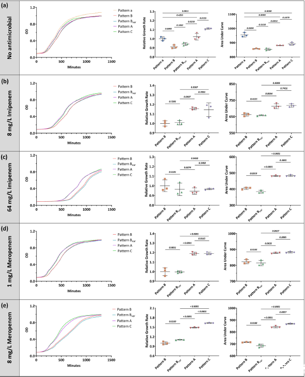 图4、实验性ST463菌株中与不同KPC相关质粒相关的适应性成本。测试了各种条件下的生长过程:a)无抗生素、b)8 mg/L亚胺培南、c)64 mg/L亚胺培南、d)1 mg/L美罗培南和e)8 mg/L美罗培南。面板中的每个数据点对应于从三个技术重复(n=3个生物独立样本)计算出的一个生物重复。