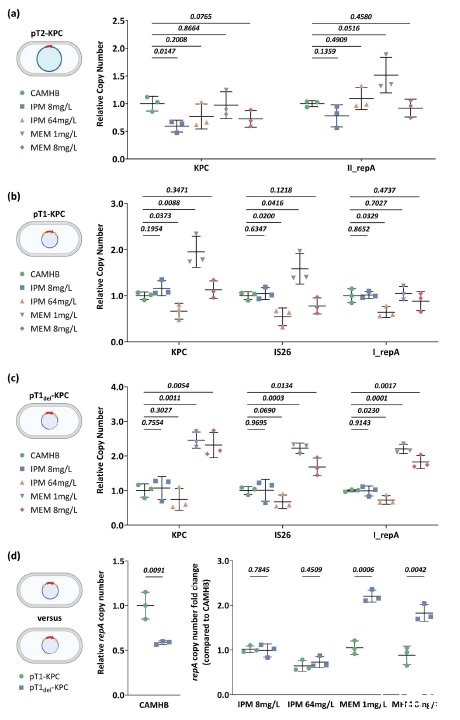 图5、不同碳青霉烯类压力下的基因拷贝数变化。a-c)pT2-KPC、pT1-KPC和pT1del-KPC质粒的基因拷贝数。d)pT1-KPC和pT1 del-KPC质粒之间的比较。面板中的每个数据点对应于从三个技术重复(n=3个生物独立样本)计算出的一个生物重复。