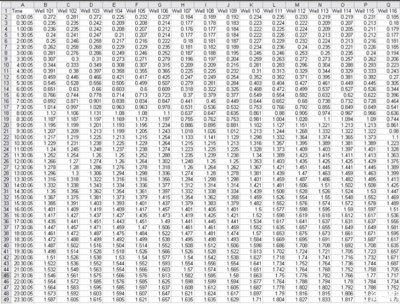 图1.Bioscreen程序"EZExperiment"的数据输出。A列显示进行吸光度读数的时间。后续列代表接种了来自衰老培养物的细胞的蜂窝板各孔