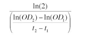 其中OD_{1}和OD_{2}代表连续的OD测量值,t_{1}和t_{2}是测量间隔时间。仅计算OD值在0.2到0.5之间的倍增时间。这些值的平均值即为该孔的倍增时间。仅计算OD值在0.2到0.5之间的倍增时间。这些值的平均值即为该孔的倍增时间。大多数野生型酵母菌株的倍增时间值应在85到90分钟之间。