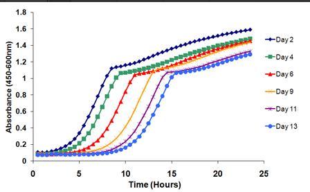 图2.单个生物学重复在整个实验过程中的生长曲线。随着衰老培养物中的细胞失去活力,曲线随时间发生明显移动。初始时间点(第2天)与后续时间点之间的时间长度决定了该特定年龄的活力。