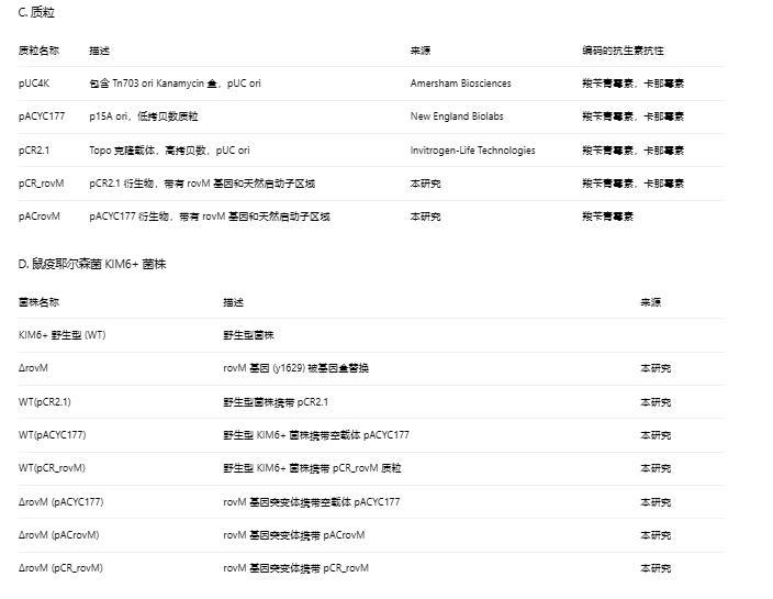 使用pKOBEG方法创建鼠疫耶尔森菌ΔrovM突变株,其中整个靶基因被来自pUC4K的Tn703卡那霉素盒替换。使用引物对lxmarovMf/lxbarovMr和rxbarovMf/rhindrovMr通过PCR从鼠疫耶尔森菌KIM6+基因组DNA中产生rovM基因的左右侧翼区域。将这两个PCR片段分别克隆到pUC19的Xmai/XbaI和XbaI/HindIII位点。使用引物kanxbaf和kanxbar扩增卡那霉素盒,并将其克隆到含有rovM侧翼区域的pUC19质粒的XbaI位点。将新质粒pUC19rovM500flanking用作模板,使用引物lxmarovMf和rhindrovMr生成线性PCR片段,用于pKOBEG方法进行诱变。通过DNA测序验证突变。ArovM::kan突变体在此简称为ArovM。使用引物lxmarovMf和rhindrovMr从鼠疫耶尔森菌KIM6+基因组DNA生成包含rovM基因和天然启动子区域的片段,并将该片段克隆到高拷贝数质粒TOPO-pCR2.1(pCR_rovM)中。然后,通过用BamHI和XhoI消化pCR_rovM质粒分离包含rovM基因和天然启动子区域的片段,并将其克隆到低拷贝数质粒pACYC177(pACrovM)的相应位点上。通过DNA测序验证构建体。通过电穿孔分别用pACrovM或pCR_rovM转化ArovM突变体,以实现rovM突变的反式互补。用空pACYC177质粒转化鼠疫耶尔森菌ArovM突变体和野生型菌株,并用pCR_rovM构建体转化野生型菌株用于比较rovM过表达实验。除非另有说明,所有后续实验均使用携带质粒的菌株进行。本研究中使用的所有菌株和引物列于表1。