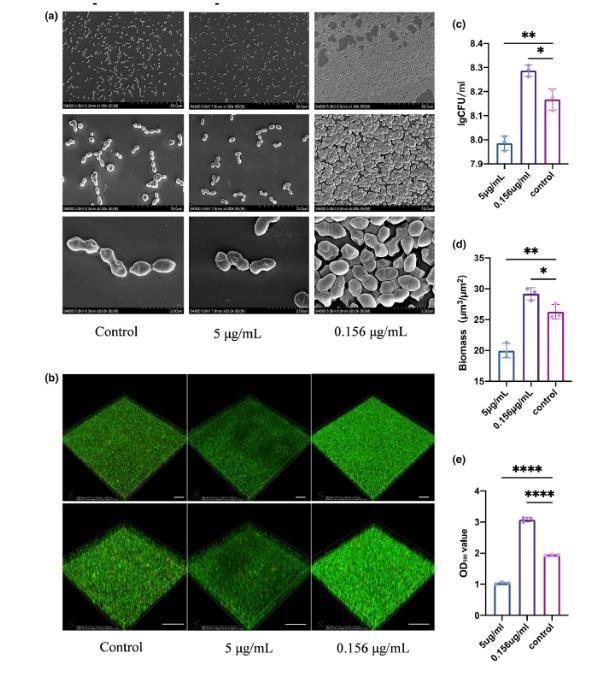 图3 、白色念珠菌EVs对粪肠球菌生物膜具有双重作用。(a)用不同浓度的EV处理后粪肠球菌生物膜形成的扫描电镜照片。(b)用不同浓度的EV处理后,粪肠球菌生物膜在细胞攀爬片上染色的代表性CLSM图像(比例尺=50μm)。(c)用不同浓度的EV处理的粪肠球菌生物膜的CFU。(d)基于共聚焦图像的粪肠球菌生物量定量。(e)用不同浓度的EV处理的粪肠球菌生物膜的结晶紫染色。数据以平均值±标准差表示。*p<0.05,**p<0.01,****p<0.0001。