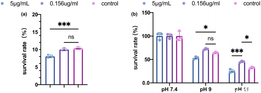 图4、 白色念珠菌EVs对粪肠球菌对有害环境的抵抗力具有双重作用。(a)粪肠球菌生物膜对3%NaOCl的存活率。(b)在饥饿碱性环境下培养的粪肠球菌生物膜的存活率。在pH9.0和11.0的PBS中的存活率由对照组(pH7.4)的细胞数标准化。数据以平均值±标准差表示。*p<0.05,***p<0.001,ns,无显著性。