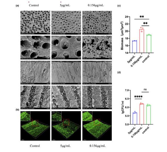 图5 、不同浓度的白色念珠菌EVs对粪肠球菌感染牙本质和在杜仲胶上形成生物膜的影响相反。(a)用不同浓度的EV处理后,根管壁和牙本质小管内粪肠球菌的扫描电镜照片。(b)用不同浓度的EV处理后,粪肠球菌生物膜在杜仲胶顶面染色的代表性图像(比例尺=50μm)。红色框显示了生物膜的部分放大视图(比例尺=20μm)。(c)基于共聚焦图像的粪肠球菌生物量定量。(d)与不同浓度EV共培养的杜仲胶上粪肠球菌生物膜的CFU。数据以平均值±标准差表示。*p<0.05,**p<0.01,****p<0.0001。