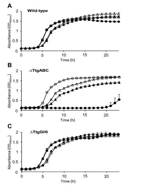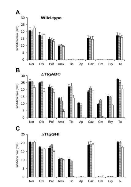 已有研究利用荧光染料HPF监测抑菌化合物诱导的体内荧光淬灭,我们进行了类似实验:在添加50%MIC浓度药物3小时后监测HPF荧光,该浓度和时间可保证野生型和突变体菌株100%存活。结果显示,氯霉素(图1B)、红霉素和四环素等抑菌化合物不会引起恶臭假单胞菌及其突变体的HPF荧光淬灭,这与大肠杆菌的实验结果一致;野生型DOT-T1E在氨苄西林(图1C)和诺氟沙星作用下出现HPF荧光淬灭。我们还检测了T1E-18、T1E-PS28和双突变体T1E-PS32的HPF荧光淬灭响应:100μg/mL氨苄西林即可诱导DOT-T1E-18的淬灭反应(图1I),该浓度是野生型菌株发生淬灭所需最低浓度的1/3;双突变体T1E-PS32在更低浓度(1/15)下即可诱导HPF荧光淬灭(图1L)。这些结果表明,尽管基于HPF淬灭模式和亲本菌株及突变体T1E-PS32的耐药性特征,TtgGHI外排泵在氨苄西林排出中的作用较弱(图1),但仍需将氨苄西林排出功能归因于TtgGHI——因为ttgABC/ttgGHI双突变体在远低于T1E-18的氨苄西林浓度下即发生HPF荧光淬灭,且对多种抗生素的敏感性更高。