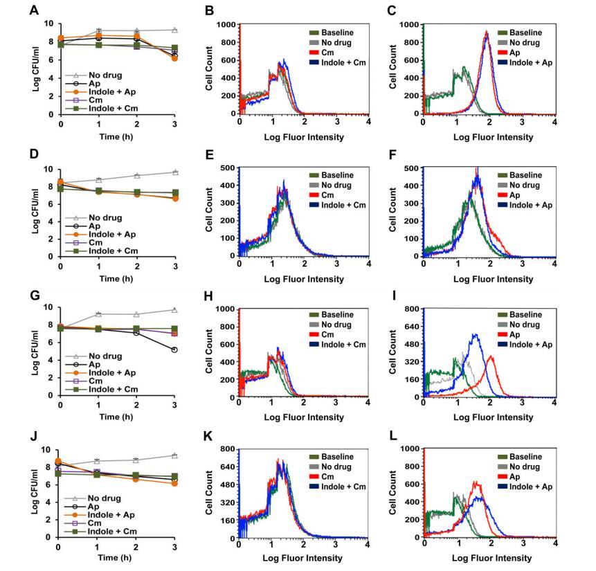 结果显示,亲本菌株(图2A)和T1E-PS28(图2A和C)在有无大肠杆菌培养上清液存在时的抗生素耐药性水平相似;在无培养上清液或添加tnaA突变体上清液时,T1E-18的抑菌圈大于亲本菌株,这种差异在替卡西林、氨苄西林和氯霉素作用下尤为显著(图2);而添加大肠杆菌LK111上清液后,T1E-18对所有抗生素的耐受性增强,耐药性水平与添加纯吲哚时相当。这表明肠杆菌产生的吲哚可有效促进恶臭假单胞菌的抗生素耐药性,通过监测恶臭假单胞菌的生长曲线进一步证实:200μg/mL氨苄西林可抑制DOT-T1E18的生长,而添加大肠杆菌上清液可缓解这种抑制效应(尽管细胞进入对数期前存在短暂延迟,且生长速率比无抗生素时慢20%)(图3)。