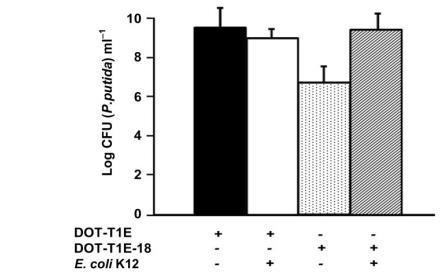 随后,我们检测了恶臭假单胞菌野生型、DOT1E-18与产吲哚大肠杆菌菌株在有无抗生素存在时的体内生长情况:将大肠杆菌与各恶臭假单胞菌菌株以相同细胞密度(10^5 CFU/mL)接种到不含抗生素或含氨苄西林的LB培养基中,以各菌株单独接种作为对照;通过在LB+氨苄西林+链霉素(大肠杆菌选择性培养基)上涂布计数大肠杆菌细胞数量,在LB+利福平上计数DOT-T1E,在LB+利福平+卡那霉素上计数T1E-18。结果显示,8小时后共培养物达到稳定期;在对照培养物和各共培养物中,大肠杆菌细胞密度均约为10^8 CFU/mL,DOT-T1E或T1E-18的细胞数量与之相近,表明无抗生素存在时各菌株的适应性相当。我们在300μg/mL氨苄西林存在下重复了上述共培养实验:大肠杆菌因质粒pMRS101携带bla基因而对该药物耐药,DOT-T1E菌株主要通过TtgABC泵排出抗生素而耐药,而T1E-18菌株的生长则受氨苄西林抑制(见图4);结果显示,只有当培养基中存在大肠杆菌LK111时,T1E-18才能在氨苄西林存在下生长(图4),表明种间信号传导具有功能活性,且恶臭假单胞菌可通过识别大肠杆菌产生的化学信号在含抗生素的培养基中增殖。