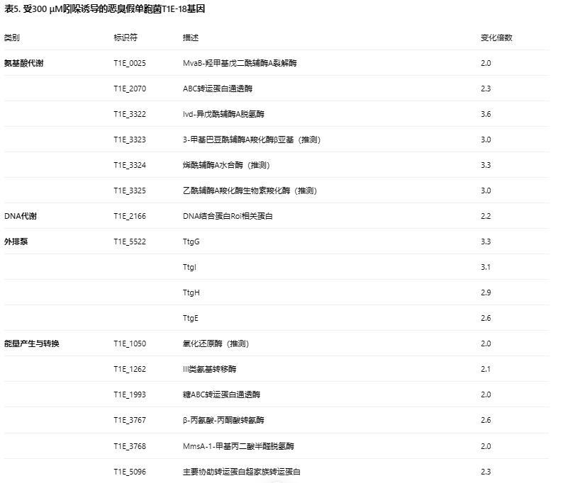 我们在T1E-18(ttgABC缺陷菌株)中进行了相同实验:T1E-18菌株中的外排泵ttgGHI上调2.6-3.7倍(表5);且T1E-18中一些在亲本菌株中未被诱导的基因也发生了诱导表达,特别是参与支链氨基酸代谢的基因(T1E_3322至T1E_3325、T1E_5100和T1E_5101)以及其他与氨基酸代谢相关的基因。这些结果表明,TtgABC的缺陷和TtgGHI的诱导会影响恶臭假单胞菌对吲哚的响应。