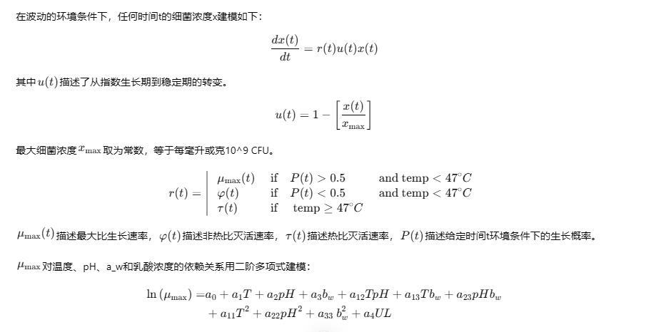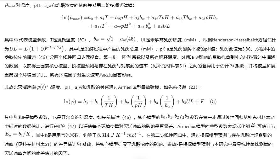 在温度大于约47°C时,温度本身对大肠杆菌表现出致死效应,并且温度对大肠杆菌灭活的影响发生急剧变化,这需要开发热灭活模型。因此,开发了一个热灭活模型来描述温度对大肠杆菌的致死效应。为此,将ComBase中报告的49°C至55°C温度范围和pH 7下测量的38个热灭活速率与萨拉米香肠在相同温度和pH下报告的结果进行了比较。在后者的研究中,在49至62°C之间的几种热处理下,大肠杆菌O157:H7在pH 4.4和4.8的pepperoni中的响应被量化。在pH 4.8的萨拉米香肠中观察到最大的耐热性。该数据集用于拟合热灭活模型参数(表2)。