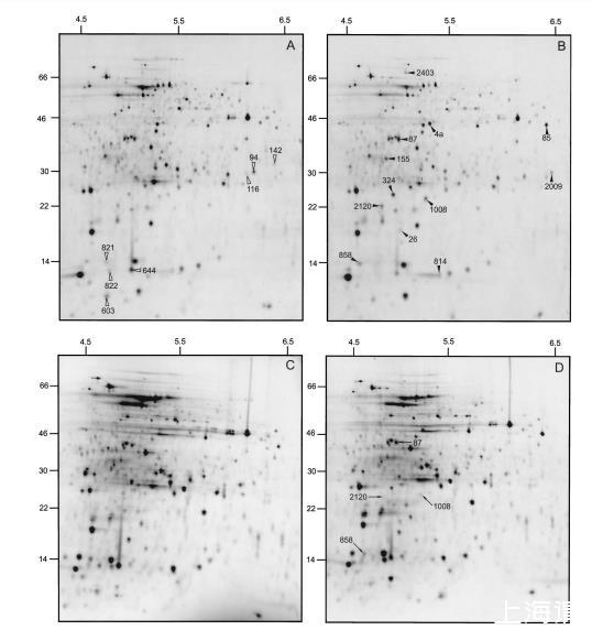 SMHK11的酸刺激子。通过比较暴露于pH 7.5和5.5条件下30分钟的总细胞标记蛋白的二维凝胶电泳,分析了NG8和SMHK11的ATR背后蛋白质表达的变化。在这些实验中监测的594个蛋白质中,所有那些在酸暴露30分钟后表达差异>2.0或<0.5的蛋白质被分别分类为属于NG8和SMHK11的酸刺激子。NG8的酸刺激子包括19个蛋白质,其中12个显示表达增加,7个显示表达减少(图7A和B;表3)。有趣的是,在酸冲击后显示表达增加的12个NG8蛋白质中,有四个蛋白质在突变菌株中没有被诱导(图7C和D;表3)。这些结果证实,SMHK11在诱导酸应激蛋白方面相对于亲本菌株NG8存在缺陷,并证实hk11在可诱导的ATR中起着重要作用。