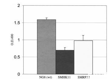 删除hk11或rr11基因导致生物膜形成缺陷,如图3所示。菌株SMHK11的生物膜密度约为亲本菌株NG8的50%,菌株SMRR11的密度约为亲本菌株的75%。观察到的突变体生物膜密度降低不太可能是由于它们略微降低的生长速率所致,特别是因为它们在中性pH下的生长产量与亲本菌株在TYEG(图2)和SDM培养基(数据未显示)中几乎相同。