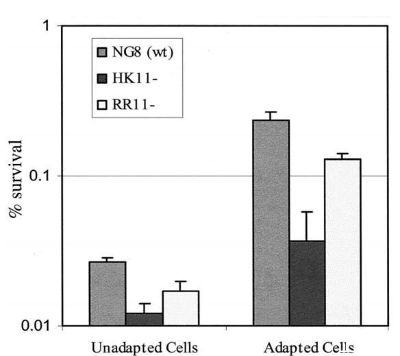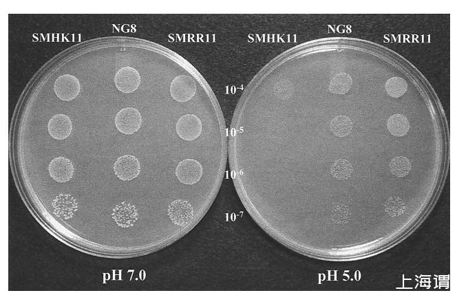 与亲本菌株NG8相比,SMHK11和SMRR11突变体在pH 5.5的液体培养物中均显示出生长速率降低。NG8的Td为100±1分钟。SMHK11的Td为178±3分钟,而SMRR11每207±9分钟倍增一次(图2)。突变体SMHK11在pH 5.0的琼脂平板上的生长也大大减弱,尽管它在pH 7.0的平板上(图5)和pH 7.0的肉汤中(图2)生长与亲本菌株一样好。有趣的是,我们未能在pH 5.0平板上检测到SMRR11突变体与亲本菌株NG8生长之间的差异。为了更仔细地确定删除hk11或rr11基因是否影响可诱导的ATR,我们使用先前描述的方法测定了在液体培养物中生长的突变体的对数期ATR。结果显示,SMHK11突变体相对于亲本菌株NG8具有降低的ATR(图6)。然而,删除rr11仅导致可诱导ATR轻微下降,如菌株SMRR11所示。