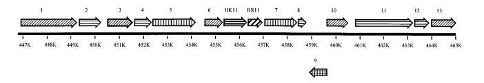 编码rr11的ORF位于bp 456336至456983,编码一个推定的215个氨基酸的假设蛋白,预测分子量为24,067 Da。有趣的是,这些基因重叠了12个核苷酸,并且应答调节蛋白编码基因在其推定起始密码子5'端有一个启动子样结构。在这个5'近端区域,-18至-10序列TACCAACT与肺炎链球菌的com-box共识序列仅相差一个碱基对(TACGAACT)。这些com-box基因构成了CSP介导的调节子的一部分。hk11基因也有推定的-10(-12,TAATGA)和-35(TGTTATGGA)启动子序列。然而,它在这个附近似乎没有com-box。与hk11基因类似,rr11与来自化脓性链球菌的相应应答调节基因(SPy1621)和来自肺炎链球菌的R03基因具有最高同源性,但与来自枯草芽孢杆菌的假设应答调节基因yvqC具有更高的相似性,而不是与耐盐芽孢杆菌的同源物。目前尚未将任何推定的底物或信号分配给这些生物体中的任何这些系统。