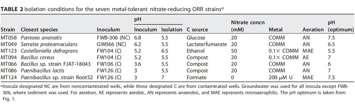 这21种ORR菌株中的七种被选择进行深入研究,基于它们厌氧生长通过硝酸盐还原的能力(表2)。这些被命名为MT049、MT058、MT066、MT086、MT094、MT123和MT124。它们的富集条件及其最接近的16S rRNA基因序列分析亲属示于表2。七种菌株中,五种从ORR S-3池塘附近高度污染地下水接种的富集中分离,一种(MT049)来自未污染ORR地下水样品,另一种(MT058)来自未污染ORR土壤样品。它们包括两种Bacillus(MT066和MT094)和两种Paenibacillus(MT086和MT124)革兰氏阳性菌株,以及各一种Pantoea(MT058)、Castellaniella(MT123)和Serratia(MT049)革兰氏阴性菌株。七种菌株中的六种在存在至少20 mM硝酸盐下分离,而四种在存在COMM下分离,两种在存在0.1x COMM下分离,一种在存在200μM U无其他金属下分离(表2)。菌株分离使用的碳源包括甲酸盐、乙醇、葡萄糖、乳酸-富马酸盐混合物和堆肥茶。后者从商业堆肥设施获取的堆肥制备,用于富集两种Bacillus菌株和一种Paenibacillus菌株。