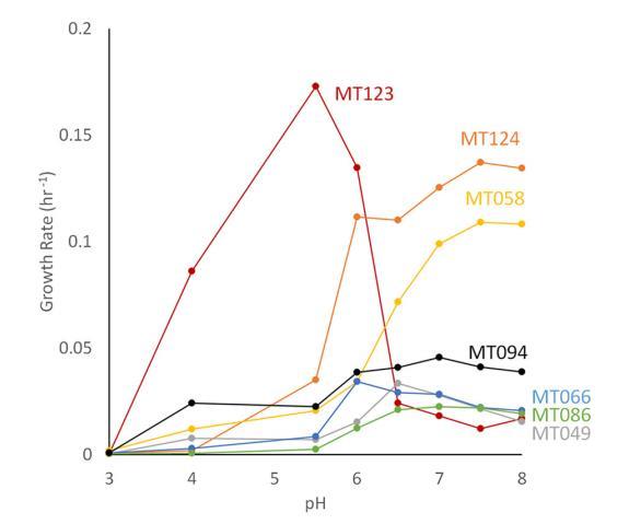 七种ORR菌株在厌氧条件下生长于20 mM硝酸盐和指定碳源下的pH曲线示于图1。在大多数情况下,菌株分离来源的ORR地下水样品的pH值低于分离所用富集培养基的pH(表2)或分离物观察到的pH最适值(图1和表2)。例如,两种Paenibacillus物种(MT086和MT124)从具有最低pH(3.0)和大多数污染金属最高浓度的地下水(井FW126)分离(表1)。然而,MT086在pH 5.5富集,生长最适pH从6.0到8.0(图1),而MT124在pH 7.0富集,生长pH范围从5.5到8.0,最适pH 7.5(图1和表2)。没有分离物在pH 3.0生长;然而,所有三种革兰氏阴性分离物(MT049、MT058和MT123)以及一种Bacillus革兰氏阳性分离物(MT094)在pH 4.0有可测量生长(图1),每种情况都低于它们分离来源地下水的pH(表2)。Castellaniella物种菌株MT123是最耐酸的,最适pH 5.5,低于富集pH(6.5)。所有其他菌株的pH最适值显著高于分离所用培养基。例如,Bacillus sp.菌株MT066有围绕7.0的宽pH最适值,并在pH 5.5富集。