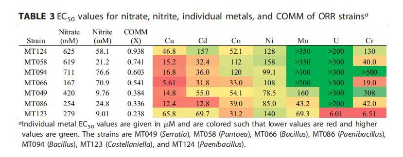 ORR S-3池塘附近污染地下水的定义特征之一是多种金属的升高浓度,这些金属以三种不同离子形式存在,取决于金属和氧化态。地下水含有升高浓度的阳离子Al3+、Fe2,3+、Cd2+、Cu2+、Co2+、Ni2+和Mn2+,氧阴离子CrO42-,以及氧阳离子UO2+。对所有七种ORR菌株获得了剂量响应曲线,使用所有这些金属,单独或与COMM。Al和Fe未包括在本研究中,由于沉淀问题(Al3+和Fe3+在我们的生长培养基中在pH>5.5和>3.0时沉淀)。还测定了所有七种菌株对硝酸盐和亚硝酸盐的敏感性。剂量响应曲线用于计算每种离子或COMM的半最大效应浓度(EC50)值,这些示于表3。