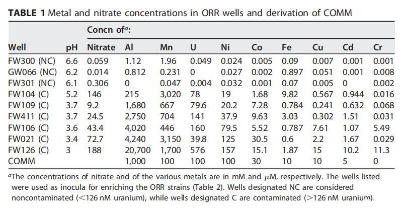 为了确定ORR污染点是否存在微生物,能够通过硝酸盐还原在髙浓度金属存在下获取生长能量,配制了一种多金属混合物(COMM),包含八种金属(Al、Mn、Fe、Co、Ni、Cu、Cd和U),模拟ORR点S-3池塘附近高度污染井中地下水的金属。COMM的组成如表1所示。这代表了先前对ORR污染点80个不同地下水井分析中测量的金属浓度。例外是Mn和Al的浓度,在COMM中显著低于最严重污染井,以最小化使用的生长培养基中的沉淀问题。为了分离新菌株,设置了一系列超过2000个高通量富集,使用ORR未污染和污染区域的地下水和水沉积物作为接种物。未污染水定义为含铀量低于126 nM(EPA饮用水允许限值),这存在于ORR S-3池塘污染羽流外的井中。COMM添加到约90%的富集中,其余包含either 10倍较低浓度(0.1x COMM)或升高U浓度(100至400μM;COMM含100μM U)而无其他金属。硝酸盐使用浓度为20 mM或50 mM,也基于污染井中的浓度(表1)。富集中变化的其他参数包括碳源(乙醇、乳酸、富马酸盐、丙酮酸盐、葡萄糖、纤维素或堆肥茶)、pH(3.0至7.0)、氧合(好氧、微好氧[3%O2]或厌氧)以及存在硫酸盐(20 mM)而非硝酸盐或无末端电子受体添加。富集在22°C培养,生长在3个月内监测。从显示生长的富集通过平板分离获得分离物。