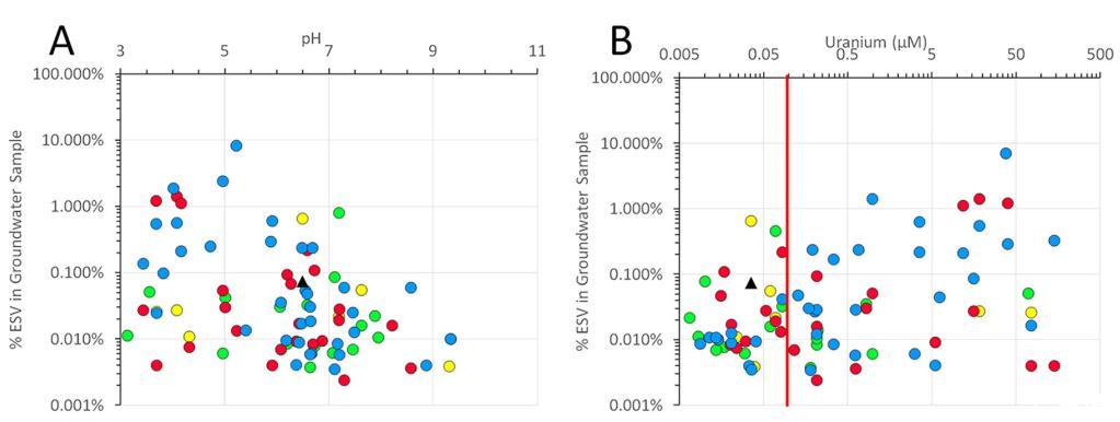 如图4所示,所有五种ORR菌株的ESV匹配发现在井中跨越宽范围pH值(从3.1到10.4)(图4A)和铀浓度(0.007到143μM)(图4B)。实际上,对于所有在多个井中发现的四种菌株(MT049、MT058、MT094和MT123),每种都在未污染(pH~7.0,U<;0.126μM)和高度污染井(pH<4.0,U>70μM)中发现。