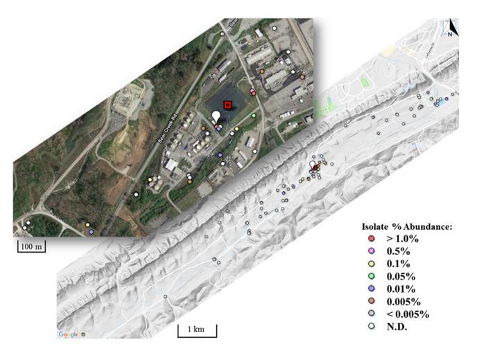 每个井位置的ESV丰度显示用于MT123(图5)、MT049、MT058和MT094。如图5所示,井跨越一个11公里x 1公里区域within Bear Creek Valley包含S-3池塘。分离四种ORR菌株(有ESV数据可用)的井用白色指针标记,S-3池塘用红色方块指示(图5)。